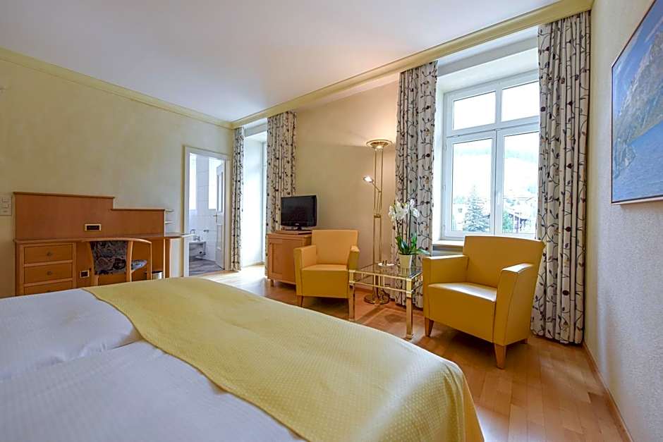 This suite is located on the south side of the hotel. A private bathroom is fitted with a bath tub, double-sink and bidet. Some suites have separate showers available, also with a separate toilet with a sink. A small seating area with 2 chairs and a table is provided and some have also a walk-in closet, wide-sweeping view of Celerina in the direction of Pontresina and Piz Rosatsch. This suit has Carpet flooring.